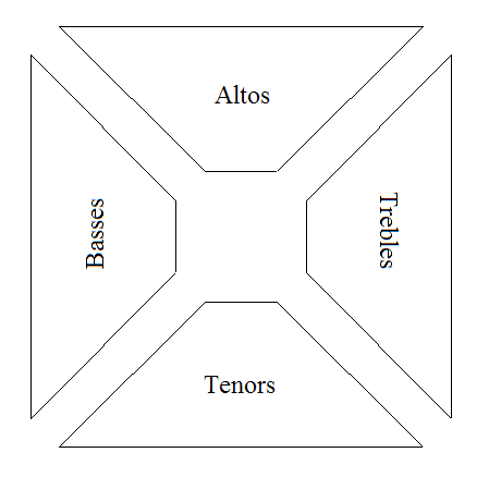 Sacred Harp groups sing a cappella. The singers arrange themselves in a hollow square, with rows of chairs or pews on each side assigned to each of the four parts: treble, alto, tenor, and bass. The treble and tenor sections are usually mixed, with men and women singing the notes an octave apart.